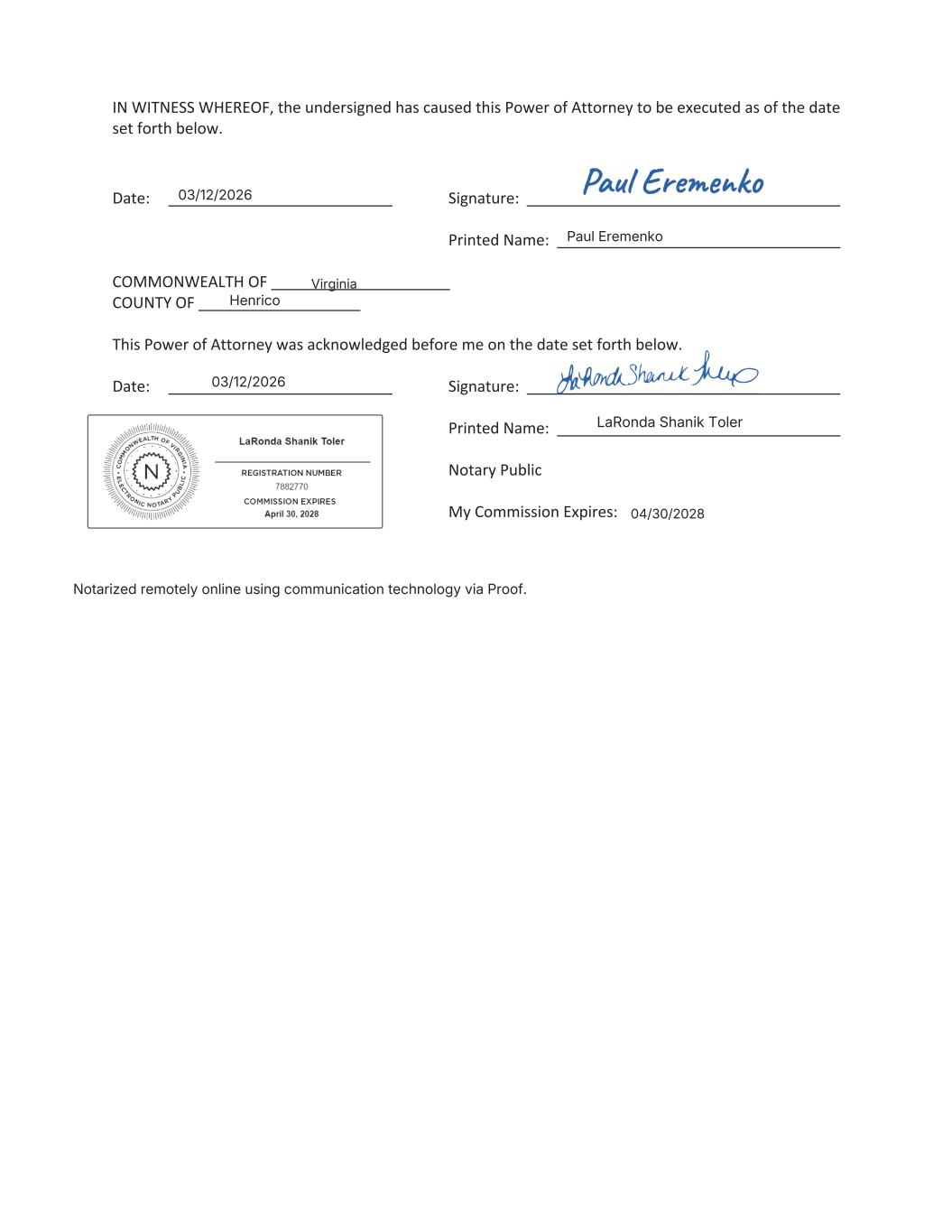| Hilary L. Hageman, Attorney-in-fact | 04/10/2026 | |